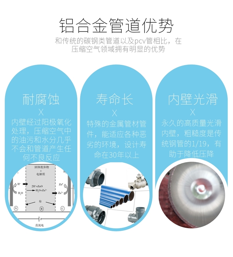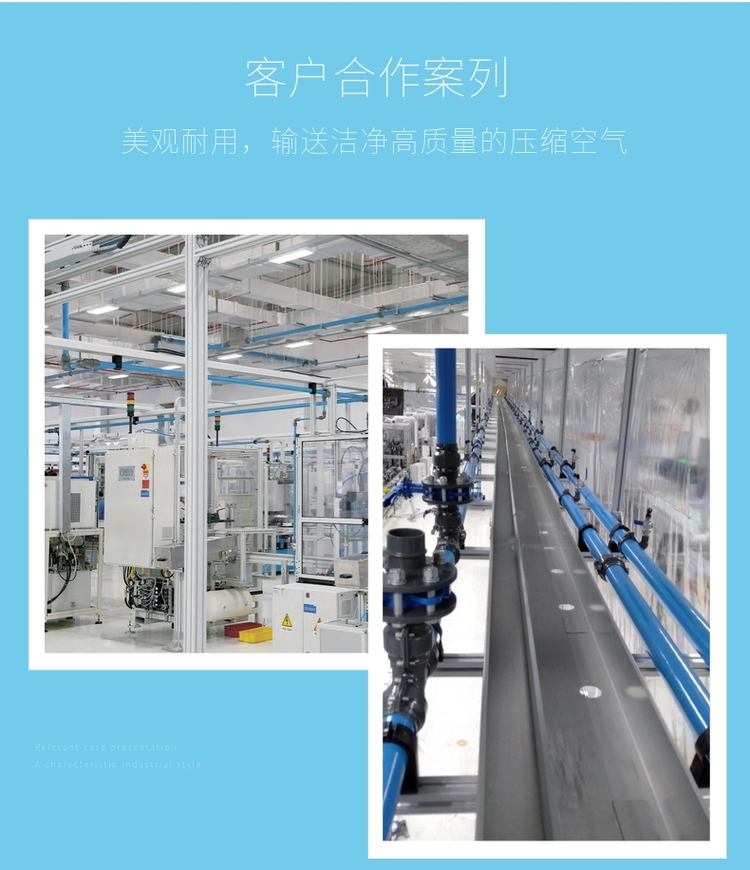 光滑的鋁管經(jīng)過陽極氧化處理,從生成點到各個使用點之間輸送穩(wěn)定的高品質(zhì)壓縮空氣,避免產(chǎn)生二次污染,同時保護下游設(shè)備和制造流程;
