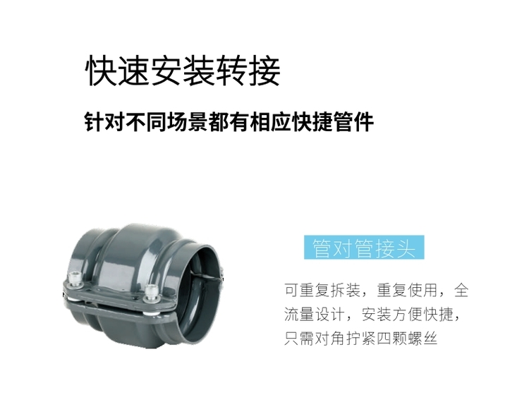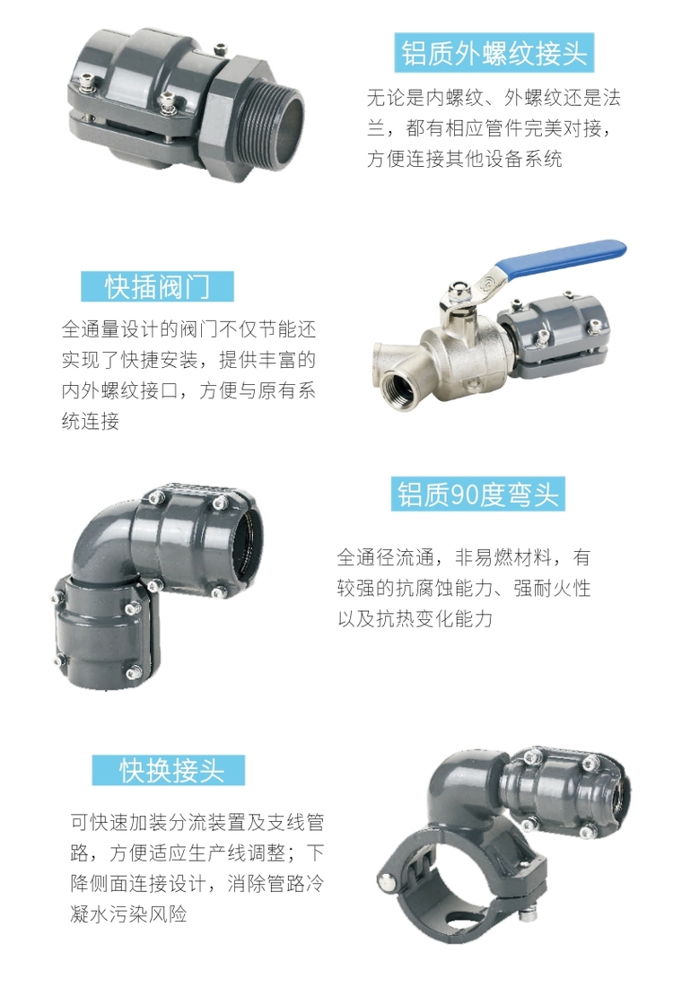 快速加裝及分流裝置,輕松、快捷安裝不費力;管路和連接件快速安裝,無需焊接,內(nèi)置整體式面密封,確保無泄漏;產(chǎn)品具備靈活性,所有的部件易于調(diào)整、更換并可重復(fù)使用,因此有助于未來管網(wǎng)增設(shè)擴大,完美兼容各種工廠空間、管道設(shè)備。