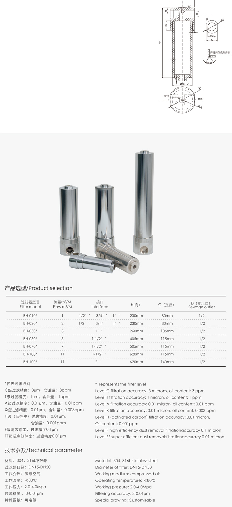適用于濾去4.0Mpa以下的壓縮空氣的固態(tài)和液態(tài)雜質(zhì),高壓氣體精密過濾器采用精密度制造工藝,充分考慮了高壓技術(shù)的要求。由高等級304、316L不銹鋼制成可提供25、5 、1和0.01um及活性炭過濾等級性能濾芯,滿足客戶各種特殊要求,應(yīng)用空氣動力學(xué)原理進(jìn)行設(shè)計,確保將過濾介質(zhì)壓降降到最低。